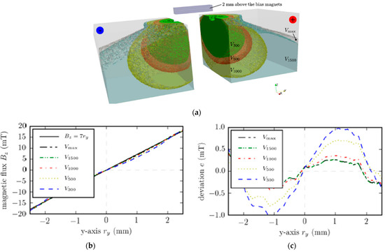 Topology-optimized magnetic configuration with different volume constraints. (a) Picture of the topology with different volume constraints. (b) Stray field Bz 2 mm above the magnets with different volume constraints. (c) Deviation between simulation and the given linearly increasing field [55].