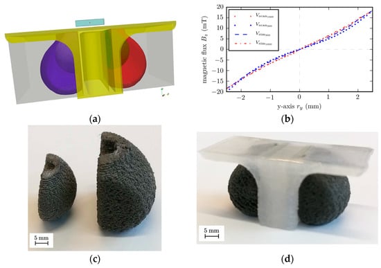 Figure 4 shows magnets printed according to the designed CAD model and the assembled magnetic device (Figure 4d). The magnetic flux density values obtained from the simulation and experiments suggest good data convergence and the possibility of using 3D printing to obtain a precisely specified topology. Such a magnetic assembly can be used in field linearity control systems, where high uniformity of magnetic fields is required.