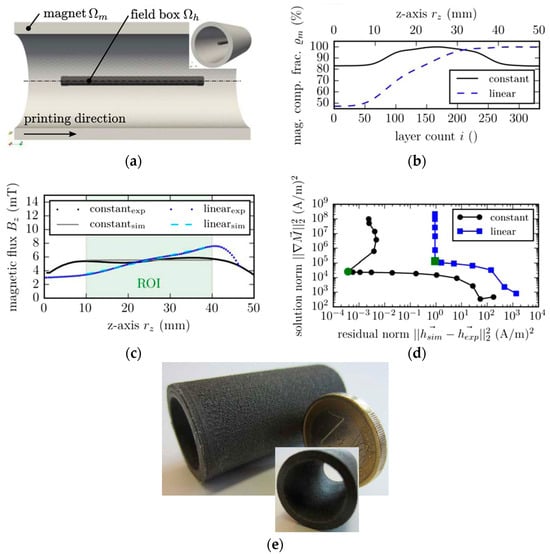 Three-dimensional prints of a magnetic hollow cylinder with a variable magnetic compound fraction distribution to generate a predefined stray field inside the cylinder. (a) Model of the hollow cylinder magnet with the dimension in mm (∅25, ∅20, 50 (douter, dinner, L)) with a predefined stray field in the field box (∅2, 30 (d, L)). (b) Magnetic compound fraction distribution ρm along the z-axis rz to create a constant and linear stray field in the field box. (c) Stray field measurements of Bz compared with inverse stray field FEM simulations in the middle of the hollow cylinder for the linear and constant field generation magnet. (d) L-curve for both designs to find the optimal Tikhonov regularization parameter α. (e) Picture of the hollow cylindrical magnet [48].