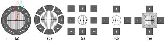 The Halbach assembly is usually a long cylinder made of magnetic material with a hole along the axis where a strong magnetic field is present. The magnetic material of the cylinder around the hole is magnetized in such a way that the angle η between the magnetization vector at any point with the angle Θ between the magnetization vector and the vertical line is equal to 2Θ (Figure 6a).
