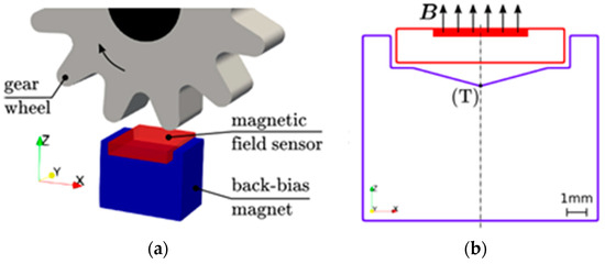 (a) Magnetic wheel speed sensing. Principle of the magnetic speed sensing. A permanent magnet is underneath the magnetic field sensor (back-bias magnet). A soft magnetic gear periodically modulates the bias field of the magnet; (b) special back-bias magnet design for giant magnetoresistance (GMR) sensors [61].