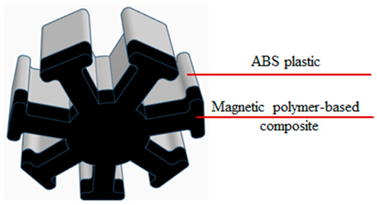 The authors of [63] investigated the use of microstereolithography (MSL) for fabricating miniature flow sensors and anisotropic magnetoresistive sensors for detecting rotating magnetic fields. This method allows for obtaining a good degree of detail, but the resulting products are very limited in size, and such products can only be used as miniature sensors in laboratory setups [64]. In [65], the FDM method was used to fabricate a similar flow sensor, but larger in size. In this case, the approach of multimaterial printing was used. The main body of the sensor propeller was printed from acrylonitrile butadiene styrene (ABS), and then, a magnetic composite with a polymer matrix and a magnetic filler was applied to one of the surfaces (Figure 8).