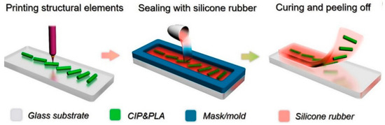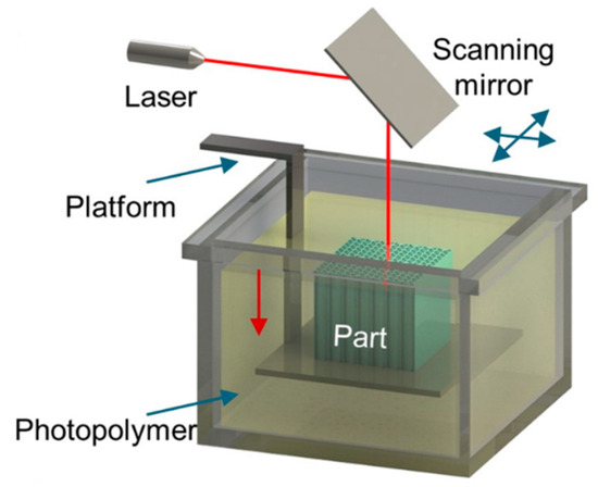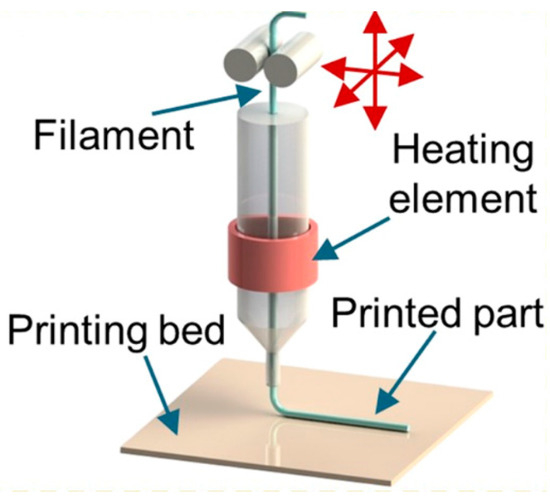 FDM technology is one of the most wide-spread and affordable polymer 3D printing technologies; its scheme is shown in Figure 9. It is also often called the fused filament fabricating (FFF) technology. It is based on the use of a thermoplastic filament that is usually 1.5–3 mm in diameter. The filament is heated up to the temperatures at which the used polymer experiences technological softening; then, the surfacing head moves along a given trajectory and the softened polymer filament is extruded through the nozzle and applied onto a special platform and, then, layer by layer to the previous layers according to a preliminary prepared 3D-CAD model. As a result, a three-dimensional product is formed.