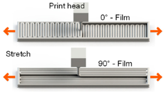 The FDM printing strategy mainly influences the mechanical characteristics of the manufactured product. For example, in [84], it was shown that, under standard tensile tests, specimens with the filament laid along the tensile direction always had better mechanical properties, including a higher modulus of elasticity, than specimens with the filament directed perpendicular to the tensile direction (Figure 12). The authors of [84] explain this fact using the higher adhesion between the filament sections in the first case. In the second case, the total contact area between the filament sections is larger, which results in a larger number of pores as they are formed between the filament sections. An increase in porosity always leads to a general decrease in mechanical properties. However, an increase in the number of layers promotes some increase in the elastic modulus, which can be explained by partial filling of voids by melting of the previous layer when applying the next one.