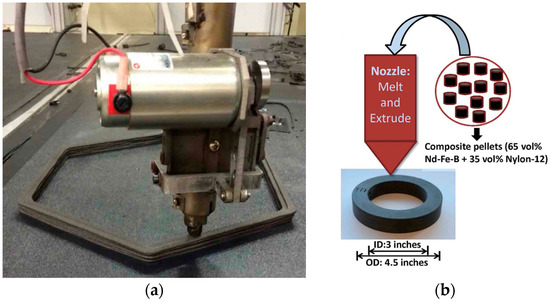 (a) Image of the nozzle depositing layers of magnetic materials on the print bed for BAAM technology; (b) schematic of the melt and extrude process, in which right underneath the nozzle is a printed magnet in a hollow cylinder shape with an OD × ID of ~4.5 inch × 3 inch [86].