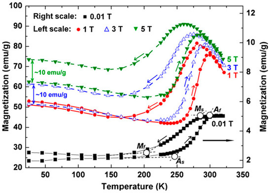 - Sutou, Y.; Kainuma, R.; Ishida, K.; Taya, M. Martensitic transformation behavior under magnetic field in Co-Ni-Al ferromagnetic shape memory alloys. In Smart Structures and Materials 2003: Active Materials: Behavior and Mechanics; Smart Structures and Materials: San Diego, CA, USA, 2003; Volume 5053, pp. 159–168. [Google Scholar] [CrossRef]