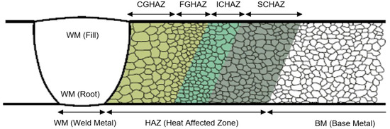 During the fusion welding process, several characteristic zones are being formed inside the welded joint, namely the base metal (BM), weld metal (WM), and heat affected zone (HAZ). HAZ is considered the part of the base metal that was not being melted during the fusion welding but was exposed to temperature below the melting point (and subsequently cooled). Width of HAZ is generally dependent on the type of welding process and the process parameters. Boundary between WM and HAZ is the fusion line (FL). The HAZ zone further consists of several characteristic segments with different microstructures and mechanical properties. These segments, arranged in the direction from weld metal to base metal, are as follows: the coarse-grained zone (CGHAZ), fine-grained zone (FGHAZ), inter-critical zone (ICHAZ), and sub-critical zone (SCHAZ), shown in Figure 1. Due to such segmentation, welded joints show significant heterogeneity of their microstructures, which also affect their mechanical properties in relation to specific weld zones. Research of fusion weld characteristic zones is already carried out in past studies [1,2,3].