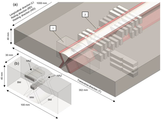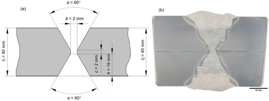 The test coupon is made from two 40 mm thick steel plates, welded in double V-butt weld (X-welded joint) configuration. Authors used this test coupon for series of different welded joint material testing, some of them published in scope of related investigations and research, therefore the overall welded test coupon length of 1000 mm is needed to accommodate all of the test specimens. Groove preparation is previously performed according to recommendations given in EN ISO 9692-1, for joint Ref. No. 2.5.1 (Figure 2a), machining the whole 1000 mm edges length of 40 mm plates [30]. Welding is carried out using the Gas Metal Arc Welding (GMAW) process with 1.2 mm diameter filler wire, using shielding gas 82%Ar + 18%CO2 with 12–16 L/min flow, in multi-pass welding (22 welding passes total) configuration, as shown in macrograph (Figure 2b).