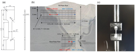 MTS testing: (a) specimen geometry; (b) specimens positioning along the welded joint transverse direction; (c) test setup.