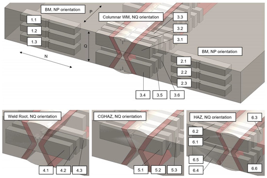 Fracture mechanics testing is carried out to investigate all of the characteristic X welded joint zones: base metal (BM), heat affected zone (HAZ), and weld metal (WM). To examine all of the zones of interest, the single edge notch bend (SENB) test specimens are placed inside the welded joint volume. When choosing the specimens positions and notch locations, the authors used the general recommendations given in BS 7448: Part 2 [34]. Such disposition of SENB test specimens inside the X welded joint is shown in Figure 5.