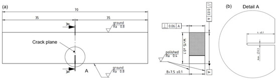 The SENB fracture mechanics testing specimens have geometry according to recommendations given in ASTM E1820 [35,36], Single Edge Notch Bend (SENB) Specimen, with specific dimensions W = 15 mm, B = 7.5 mm and overall specimen length of 70 mm, shown in Figure 6a. The specimens are manufactured by machining, with side surfaces polished and etched using the 3% HNO3 nitric acid in ethyl alcohol (Nital) to reveal welded joint characteristic zones and features in order to precisely determine the position of fatigue crack starter notches. The notch geometry according to ASTM E1820, Figure 6 (i.e., ‘Fatigue Crack Starter Notch Configurations’) is chosen to be the narrow notch type. Notches are manufactured using the electrical discharge wire cutting (EDWC) technology, with a wire diameter of 0.3 mm, as shown in Figure 6b.