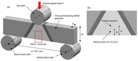 SENB fracture mechanics testing specimen: (a) specimen geometry and dimensions; (b) fatigue crack starter notch.
