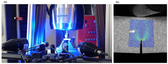 Fracture toughness testing of SENB specimen according to ASTM E1820: (a) test setup; (b) surface measurements with ARAMIS system.