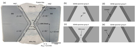 Simplification of X welded joint: (a) X welded joint macrograph with simplified fusion and HAZ lines; (b) SENB specimen group 3; (c) SENB specimen group 4; (d) SENB specimen group 5; (e) SENB specimen group 6.