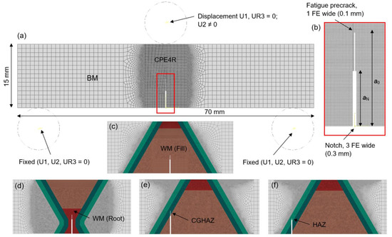 In order to model the characteristic welded joint zones, the specimens are divided according to X welded joint simplification from Figure 10. The modelled zones are BM, WM (Fill), WM (Root), CGHAZ and HAZ with mechanical properties defined from MTS specimens testing and corresponding ductile damage parameters, shown in Figure 11c–f.