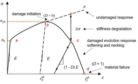 The typical tensile test stress–strain curve, with progressive damage degradation is shown in Figure 12 [44]. Initial curve partition (0a) is linear-elastic part. Past the yield stress σ0, in curve partition (ab), the material undergoes stable plastic deformation with strain hardening effect. The point b is the initiation threshold of plastic instability, with damage parameter D = 0. In the failure partition (bd) stiffness degradation and damage evolution is present. At point d damage parameter D = 1, cracked material is present as an indication of failure [44].