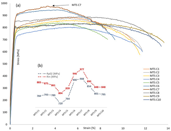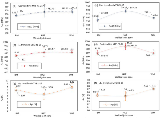 The experimental testing method with MTS specimens enables detailed investigation of tensile properties for main welded joint characteristic zones, as well as specific HAZ segments. The specific locations inside the welded joint, from which the individual MTS specimens are extracted, are listed in Table 5.