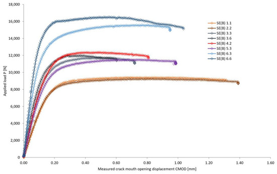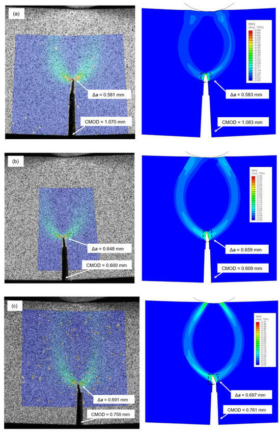 Analyzing and comparing the fracture parameters Δa and CMOD, experimentally determined vs. numerically simulated, the percentage difference for all of the examined SENB specimens is very small (<3.17%), as shown in Table 14. Therefore, it can be concluded that numerical analysis shows good overall agreement with DIC measurements, which is evident based on all simulated SENB samples.