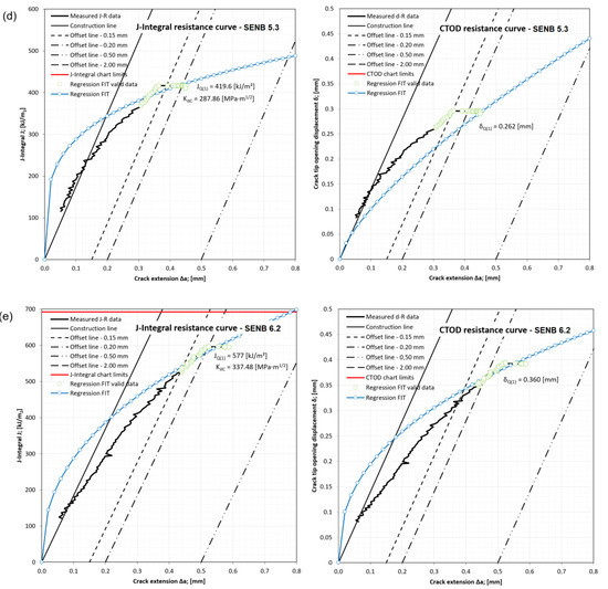 J-Integral resistance curves and CTOD resistance curves: (a) SENB 1.3 for groups 1 and 2; (b) SENB 3.6 for group 3; (c) SENB 4.1 for group 4; (d) SENB 5.3 for group 5; (e) SENB 6.2 for group 6.