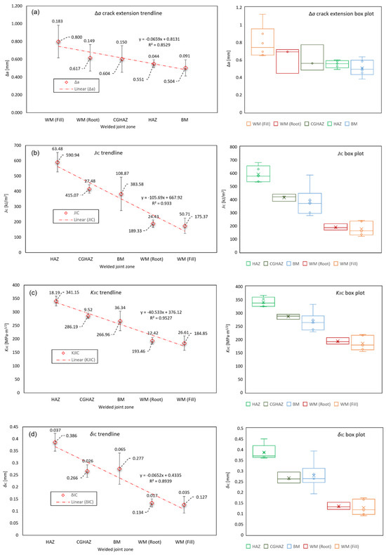 Statistical trendlines and box plots for fracture toughness parameters: (a) crack extension Δa; (b) J-integral JIC; (c) stress intensity factor KJIC; (d) displacement δIC.