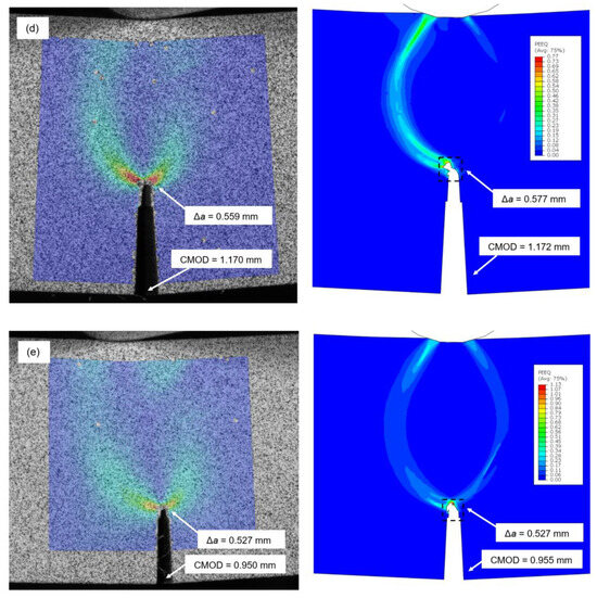 DIC vs. numerical analysis comparison—damage behavior of SENB specimens during three-point bending tests: (a) SENB 1.3 for groups 1 and 2; (b) SENB 3.6 for group 3; (c) SENB 4.3 for group 4; (d) SENB 5.2 for group 5; (e) SENB 6.3 for group 6.