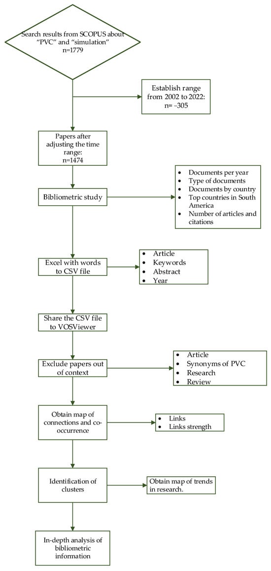The purpose of this search was to contextualize the implementation of PSE for design, evaluation, control, and optimization of the production process, involving an exploratory search for existing research on the relationship between PVC and process simulation. A systematic search was carried out in SCOPUS, focusing on the terms within the title, abstract, and keywords of the articles using the terms “PVC” and “Simulation”. The term PSE was avoided, given that it can have different meanings such as “Public Service Enterprise”, “Pseudoephedrine”, “Power Systems Engineering”, “Personal and Social Education”, among others, which introduces noise to the word map and affects the analysis. For the word PVC, some out-of-context definitions were discarded manually, such as “Premature Ventricular Contraction”, “Permanent Virtual Circuit”, or “Precessing Vortex Core”. The selected time interval was from 2002 to 2022, taking into account that 2023 is ongoing.
