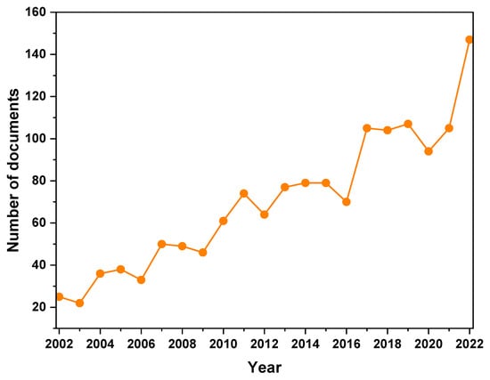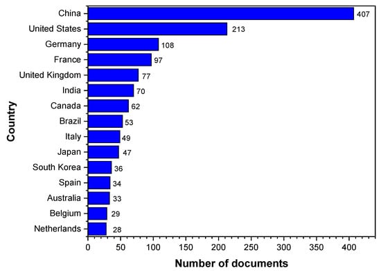 Figure 4 shows the top 15 document-producer countries and the number of publications from 2002 to 2022. From the data presented in Figure 3, it can be observed that China leads the research output with 407 documents, followed by the United States (213), Germany (108), France (97), and the United Kingdom (77). This may be attributed to several factors, including the size of the economy, investments in research and development, and the presence of a strong polymer and plastics industry. According to Statista [70], the largest PVC-producing countries are China, the United States, Germany, Japan, South Korea, India, Brazil, France, the United Kingdom, and Canada. Comparing the research output in Figure 3 with the highest PVC-producing countries, a general correlation between the two rankings can be observed. The top three PVC-producing countries, China, the United States and Germany, are also the leading countries in terms of research output in the field of “simulation” and “PVC”; this correlation suggests that countries with a strong PVC industry tend to invest more in research and development, which may result in higher numbers of publications. These countries may also have well-established research institutes and infrastructure, enabling advancements in simulation techniques for PVC applications. Developing countries such as India and Brazil also have a notable number of publications (70 and 53, respectively), suggesting an emerging interest in this field, which could be driven by an increasing demand for PVC products and a need for advanced simulation techniques in their industries.