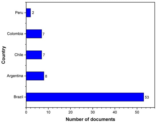 Figure 5 shows the top five countries in South America with contributions via research documents related to PVC and simulation for the period 2002–2022. In South America, the country with the most publications on the subject is Brazil with 53 articles; Argentina has 8 publications and Colombia has 7 publications, as does Chile. It can be concluded that although Colombia is in the top five and very close to the top two, more research efforts related to the topic are needed to approach Brazil’s level.