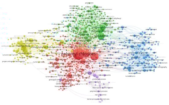 From the keywords extracted from SCOPUS to the VOS viewer for generating the map of connections and co-occurrences (Figure 7), the frequency of appearance of the keywords, the connections between keywords, and the clusters of words were analyzed. It can be seen that the most repeated ones, excluding PVC or simulation and their synonyms, are “Chlorine compounds”; this allows us to infer that PVC is studied based on its chemical nature, grouped into a series of compounds containing chlorine, an element to be studied for its toxicity as a gas and its abundance when combined with other elements such as salts or organochlorine compounds. Another frequent word and the first closely related to the trend we want to find is “algorithm” which shows that systematic operations, either quantitative or qualitative, are being developed and used to solve problems related to PVC production. This can have many work areas, such as process control, product property prediction, reaction kinetics, models for recycling, or sustainability quantification. Another high-frequency term of interest is “computational fluid dynamics”, showing that computational fluid dynamics studies involving PVC are also a specific topic of interest. However, there may be a bias since if the studies are based on pipe geometry, PVC may simply be the material of the pipe.