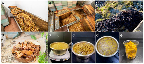Detailed portrayal of honeycomb waste management and beeswax extraction. (A–C) Depictions of residual honeycombs post-harvest, which are typically discarded in open terrain. (a) Collection of discarded honeycombs. (b) Controlled heating of honeycomb residues in distilled water on a heating plate, facilitating the melting phase of beeswax. (c) Observation of beeswax transition to a liquid state atop the warm distilled water. (d) Subsequent crystallization of the beeswax on the distilled water surface after an overnight period. (e) Rigorous extraction and refinement process of beeswax: recovery from the aqueous layer followed by a dehydration phase in an oven set at 80 °C for 2 h and a final filtration through fine-meshed cheesecloth to ensure purity.