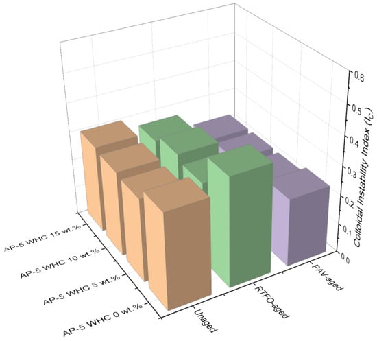 As evidenced by Figure 3, upon RTFO aging, the introduction of waste honeycomb (WHC) into the AP-5 asphalt matrix resulted in distinctive shifts within the SARA fractions, particularly in the aromatic and resin components. This transformative behavior can be mapped back to the WHC’s significant resinous character, boasting 92.07 ± 0.89 wt.%. The escalation in aromatic content can be deciphered through a dual lens: the inherent oxidative aging mechanism of RTFO fosters polymerization of lighter molecules, integrating them into the aromatic fraction [32], and there is dynamic interplay between the asphalt matrix and WHC’s components, such as esters and free fatty alcohols. This interaction, coupled with the influence of residual honey components in WHC, amplifies the aromatic presence. Furthermore, the decline in asphaltenes owes its dynamics to the peptizing potency of maltenes, an effect accentuated by WHC’s rich resin contribution, ensuring a well-dispersed state of asphaltenes. Conclusively, the post-RTFO SARA fraction alterations are a confluence of WHC’s compositional fingerprint, intrinsic asphalt aging mechanisms, and the synergistic interactions between asphalt constituents and WHC residues.