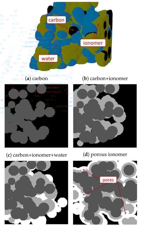- Additional features. Modifications of the morphology were incorporated to include specific features in the carbon, ionomer, and water distributions. As shown in Figure 1d, meso-porous ionomer was created by introducing water-filled spherical pores in the ionomer phase with a prescribed radius equal to the last ionomer radius used in Step 2. A total of 120 random points were selected from the ionomer phase.