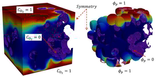 Oxygen diffusion and ionic conduction were examined by DNS of mass species and charge conservation equations, i.e., Laplace equation, at pore scale (see, e.g., [33,34])