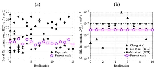 (a) Local transport resistance normalized with respect to Pt surface area, , computed in simulations with a heterogeneous CL () compared to previous experimental data presented in the literature [49,50,51,52,53,54,55]. (b) Effective diffusivity coefficient of in ionomer, , used as a baseline value in the work compared to previous experimental data reported for Nafion [35] and numerical data considered in pore-scale simulations [26,27]. Black symbols show data from previous literature sources.