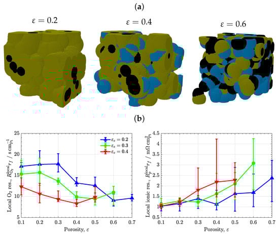 (a) Heterogeneous CL microstructures corresponding to and various porosities, . Black: carbon, orange: ionomer, blue: water. (b) Variation of local and ionic transport resistances normalized with respect to Pt surface area, and , as a function of porosity, , corresponding to three carbon volume fractions, . The error bars indicate the range of variation of results among different sample realizations.