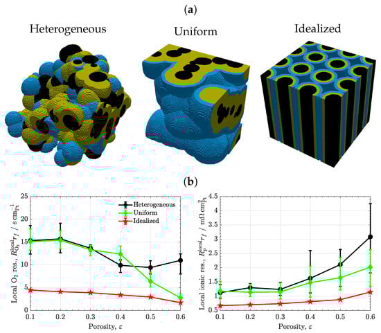 The importance of ionomer morphology is exacerbated in the samples with an idealized vertically-aligned distribution. As shown in Figure 5a, the local oxygen transport resistance of the idealized samples is low in the full porosity range, slightly decreasing from to when the porosity is increased between and . Furthermore, as shown in Figure 5b, the local ionic transport resistance is significantly reduced compared to the heterogeneous and uniform distributions, remaining between – for = 0.1–0.6. The extremely high performance of the idealized ionomer distribution arises from a minimization in ionomer agglomeration and an optimal arrangement of proton transport pathways (i.e., tortuosity minimization) [12]. Notice that the oxygen resistance of the idealized and the uniform distributions are similar at high porosity, reflecting the superior oxygen distribution in both cases. High performance at low Pt loading with vertically aligned microstructures have been previously demonstrated in several experimental works [65,66,67], where current densities as high as were reached at with and air supply. As a final remark, it is worth noting that the results of the idealized morphology do not vary among sample realizations, unlike the results calculated with random carbon particles. This fact highlights the importance of using reproducible manufacturing techniques and homogenized catalyst supports to reduce maldistribution of transport resistances, which can affect local performance and degradation rates [68,69].