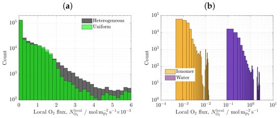 Figure 5 shows the results of the carbon/ionomer interaction for three ionomer morphologies, heterogeneous, uniform, and idealized vertically aligned distributions, as a function of porosity. A representative carbon volume fraction is considered, . As shown in Figure 5a, the local oxygen transport resistance of the heterogeneous and uniform ionomer distributions are similar at low-to-middle porosities ( 0.1–0.4). The low sensitivity of to ionomer heterogeneity is explained by the presence of both thick and thin ionomer regions in the heterogeneous samples, which lead on average to a similar oxygen resistance to that of uniform samples [59,60,61]. This situation is further illustrated in Figure 6a, which shows the histograms of the local oxygen flux at active sites of the examined samples at . For heterogeneous ionomer, the local oxygen flux distribution varies roughly linearly due to the presence of a continuous distribution of regions with high and low oxygen resistances. In contrast, for uniform ionomer, the local oxygen flux distribution is more concentrated toward intermediate values that are characteristic of the mean ionomer thickness (lower dispersion). The difference between heterogeneous and uniform ionomer distributions is enlarged at high porosity ( 0.5–0.6), where the uniform samples reach a lower oxygen resistance than the heterogeneous samples (a factor of two, vs. ). The reduction in the oxygen resistance at high porosity in the uniform samples is caused by a strong suppression of ionomer agglomeration when the ionomer volume fraction is low ( 0.1–0.2) [53]. The optimal arrangement of uniform ionomer virtually removes coalescence of ionomer films, facilitating oxygen distribution between ionomer films. Similarly, the local ionic transport resistance of the uniform samples is especially reduced compared to that of the heterogeneous samples at high porosity (a factor of two, vs. ). The superior ionic conductivity of uniform samples arises from the better arrangement of ionomer and the suppression of ineffective agglomerated ionomer regions, i.e., a tortuosity decrease [62]. Overall, the use of high porosity CLs with a uniform-as-possible ionomer distribution can be an effective way to improve performance at low Pt loading due to facilitated oxygen transport and good proton conduction [56,63,64].