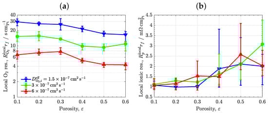 Variation of (a) local , , and (b) ionic. , transport resistances as a function of porosity, , corresponding to three effective diffusivities of in ionomer, , , (). The error bars indicate the range of variation of results among different sample realizations.