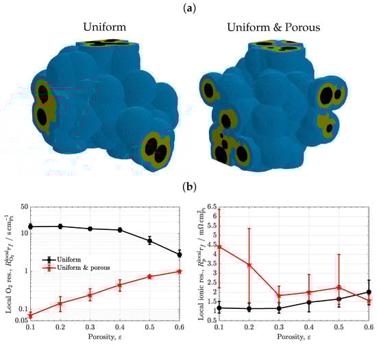 The results of the analysis of the effective oxygen diffusivity in ionomer are shown in Figure 7. The local oxygen and ionic transport resistances are plotted as a function of porosity for the heterogeneous ionomer distribution (). As expected, the local oxygen transport resistance decreases almost linearly with an increase in the oxygen diffusivity (see Figure 7a). Indeed, small deviations from linearity are caused by stochastic fluctuations that arise from random microstructures. As shown in Figure 7b, the local ionic transport resistance remains invariant with respect to oxygen diffusivity, reaching similar values to those presented in Figure 4b (except for stochastic variations among samples). The use of modified ionomers with enhanced permeability and good conductivity offers a viable route to improve performance at low Pt loading. Among available options, blended ionomers can be a satisfactory solution to produce tailored designs with balanced mass and ionic transport properties [70,71]. Nevertheless, it is worth noting that achieving a remarkable high performance may only be possible if enhanced diffusion is accompanied by a proper CL design in terms of high porosity and ionomer morphology. The increase in oxygen diffusivity shown in previous work is typical of order unity, so a disruptive increase in oxygen diffusivity may not be possible by solely altering the chemical ionomer structure [54,70,71,72,73]. Local oxygen transport can be more effectively increased by incorporating meso-porosity into ionomer, an aspect that is discussed in the next section.