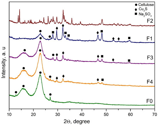 XRD patterns on the surface of the investigated fibreboards are presented in Figure 1. As can be seen, typical sharp peaks around 2θ = 14, 16, and 22, which are characteristic for cellulose, appeared for all samples except for sample F2 [37,38,39]. On the other hand, the modified fibreboards containing copper showed some diffraction lines that correspond to the following crystal phases: Cu2S (ICSD 98-062-8818) and Na2SO4 (ICSD 98-010-0458). The obtained phases proved the proposed probable mechanism of the reduction process that was reported previously by us [30]. For the samples, the F3 and F4 diffraction peaks characteristic of the cellulose were dominating compared to the other characteristic diffraction lines. For the F2 fibreboard, it was difficult to identify the cellulose diffraction peaks, but several crystal phases appeared. Clearly, sample F1 was characterized by a predominating Cu2S crystal phase compared to the other fibreboards. Obviously, for the copper content, the ratio of the modified mixture was a critical parameter. On the other hand, for successful preparation of Cu2S, both parameters, the ratio of the modified mixture and the duration of residence of the applied modifying mixture on the carpet before pressing, were important. In addition, the crystal size of the formed Cu2S was calculated by the Debye Scherrer equation. The average size of the crystals from copper sulfide varied between 20 and 50 nm. The smallest particles were calculated in sample F4, around 20 nm. For sample F1, the average size of Cu2S was 31 nm, while in samples F2 and F3, the particles had sizes at around 35 and 50 nm, respectively.