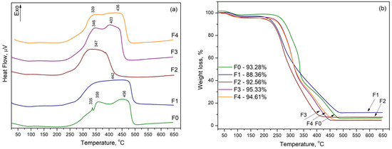 In order to determine the thermal stability of modified fibreboards the DTA/TG analysis was performed (Figure 2). The small endo effect characteristic for all DTA curves (Figure 2a) at ~70 °C was due to the moisture and volatile matters evaporation. This effect corresponded to the initial reduction in weight in the samples that appears in TG curves (Figure 2b) and the mass loss varied from 2 to 5 wt.% depending on the copper content. The next broad and intense exothermic effects may correspond to the simultaneous degradation of the lignocellulose components [40,41,42,43]. Cellulose degradation occurred in the temperature range between 200 °C and 400 °C, while lignin degradation was achieved at higher temperatures [36,37,38]. All samples showed quite similar thermogravimetry curves and thermal degradation behaviour. The mass loss varied from 88 to 95 wt.%.