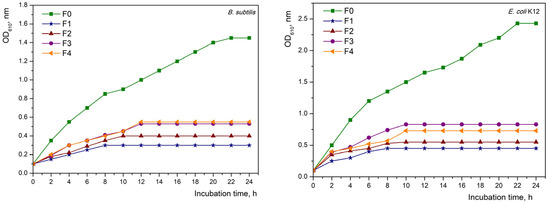 The first method for determining the antimicrobial properties of the obtained materials was by tracking the growth of microorganisms in a batch culture and constructing growth curves. In Figure 6 are presented the batch growth curves of E. coli and B. subtilis in the presence of the fibreboards for 24 h. The growth of both strains in the presence of fibreboard F0 was in the typical growth phases for microorganisms; the lag and exponential phases were clearly expressed. The presence of fibreboards of different copper content (from 1 to 4) changed the form of the growth phases, in which a significant lengthening of the lag phase and shortening of the exponential phase were observed in both studied strains. The most notable change in the growth phases was observed in fibreboard F1, where individual phases were difficult to distinguish.