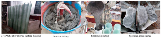Each specimen was fabricated following the subsequent steps: Firstly, the inner surface of the GFRP tube required for the test was meticulously cleaned to eliminate any dust or oil residues, ensuring a tight interface between the GFRP and concrete. The concrete mixture was prepared using a JW300 forced concrete mixer(Zhengzhou Far East Machinery Manufacturing Co. Zhengzhou, China), where the measured ultra-high-performance concrete dry mixture, water, and admixtures were thoroughly mixed to form a cohesive gel. Subsequently, the mixture was poured into the GFRP tube through a funnel and conduit (a PVC tube was employed as a mold for the reference column specimen) to ensure the compactness of the concrete placement. Once the pouring was completed, the top of each specimen was covered with plastic film to maintain moisture, and regular watering was performed for proper curing. The manufacturing process of the specimens is illustrated in Figure 2.