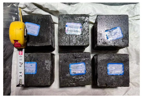 In accordance with the specified curing conditions for the specimen, three non-standard concrete cubes (100 mm × 100 mm × 100 mm) were cast, as depicted in Figure 4. The splitting tensile strength of the UHPC cube was measured in accordance with the guidelines outlined in the GB/T 50081-2019 standard [20]. It is important to note that a size conversion coefficient of 0.85 was applied to the 100 mm cube. The experimental results obtained from these tests are presented in Table 3.