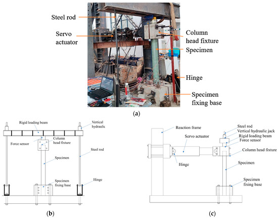 As depicted in Figure 6, we have designed and fabricated a precise loading device for our experimental setup. The lower end of the specimen is inserted into a dedicated hole beneath the fixed base. By utilizing screws positioned at both ends of the fixed base, the specimen is securely fastened to the base, which, in turn, is firmly affixed to the rigid laboratory floor using screws at the upper end. Figure 6b illustrates the vertical loading device, which comprises a fixed base specifically designed for the specimen, two hinged brackets, two high-strength steel tie rods, a rigid loading beam, a jack, and a pressure transducer. The axial force is applied using a jack with a measuring range of 100 t. Additionally, a pressure transducer with a measuring range of 2000 kN is employed to continuously monitor the axial force. To ensure accurate measurements and increase friction, the pressure transducer is placed on a column head fixture with quartz sand positioned between the transducer and the fixture, guaranteeing a level surface. Figure 6c showcases the transverse loading device, which consists of a computer-controlled electro-hydraulic servo actuator, a reaction frame, and a custom-designed fixture that securely attaches to the head of the column. The upper end of the specimen is connected to the MTS actuator via the upper fixture. The loaded end of the actuator is ball-hinged to the upper fixture of the specimen, while the other end is bolted to the reaction frame, ensuring the actuator maintains a horizontal position throughout the experiment.