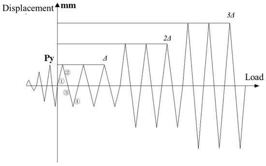 In the test procedure, the axial force is initially preloaded in a graded manner. The preloading axial force is set at 60% of the actual axial force, which is 120 kN. Throughout the test, the rationality of loading is assessed based on observation data, and the axial force is gradually increased until it reaches the predetermined level. After applying the axial force, horizontal loading is conducted using a displacement control method. The loading scheme follows the guidelines outlined in JGJ/T101-2015 [23]. The horizontal loading is initially carried out with smaller displacements, with each stage of displacement being 1 mm. Each stage of displacement is cyclically loaded once. During the test, the specimen’s behavior is monitored. When a significant decrease in the stiffness of the specimen is detected, the value of the yield displacement (∆) at this point is recorded. At this point, the specimen enters the yielding stage, and the yield displacement (∆) is recorded. The displacements applied are in the order of ∆, 2∆, and 3∆, with a total of three cycles. The experiment concludes when the peak horizontal load of the specimen decreases to 85% or less of the maximum peak horizontal load. The specific horizontal loading system can be referred to in Figure 8.