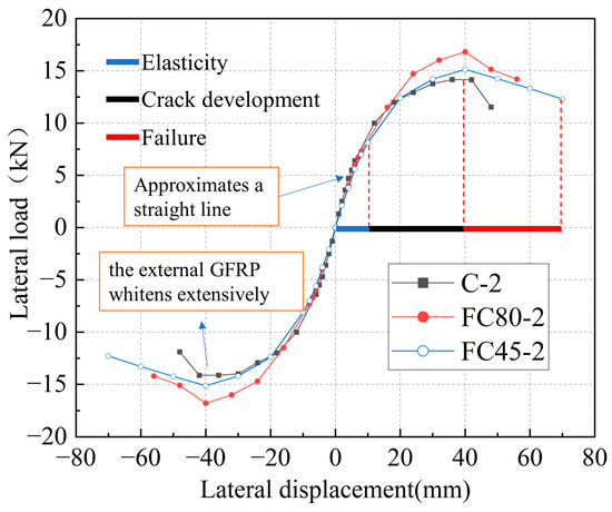 In Figure 10, the horizontal cyclic loading process of the three types of specimens can be divided into three stages: the elastic stage, the crack development stage, and the failure stage. In the initial stage of loading (within a range of +/− 20 mm), the skeleton curve of the specimens approximates a straight line, but different specimens have different horizontal loads at the same displacement, indicating differences in their initial stiffness. At this stage, the structure undergoes elastic deformation. As the displacement increases, the specimens emit slight noises, and the concrete inside the structure expands. White stripes appear on the surface of the GFRP tube in the direction of fiber winding. The GFRP tube provides confinement, and the internal concrete begins to develop initial cracks, marking the crack development stage. When the loading displacement reaches a certain level, the external GFRP turns white over a large area, indicating a decrease in confinement capacity and an intensification of core concrete damage. Eventually, the specimen loses its load-bearing capacity and enters the failure stage.