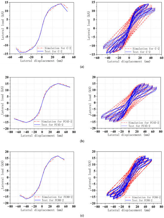 Comparisons of skeleton curves between tests and simulations. (a) specimen C-2. (b) specimen FC45-2. (c) specimen FC80-2.