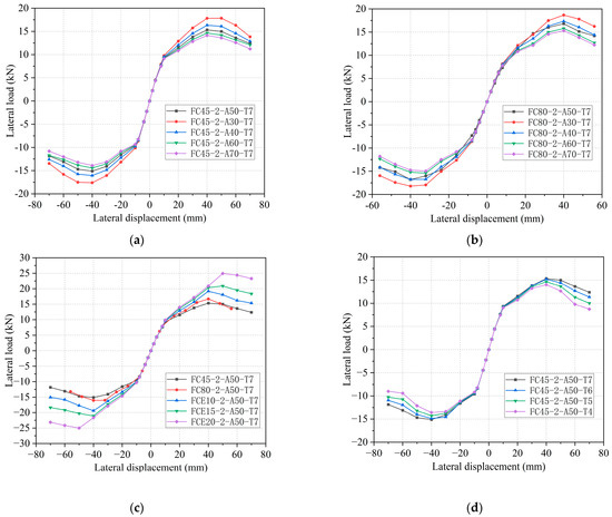 Comparisons of skeleton curves. (a) Different diameters of 45° GFRP tubes. (b) Different diameters of 80° GFRP tubes. (c) Restraint tubes of different strengths. (d) Different tensile strengths of concrete.