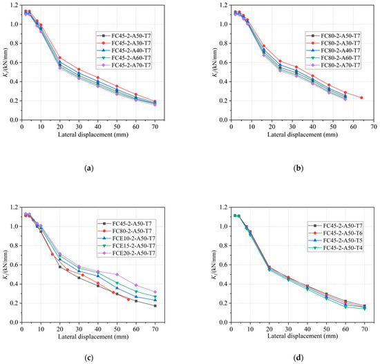 Figure 15a,b demonstrates that the specimens with two different winding angles exhibit an increase in equivalent stiffness as the diameter-thickness ratio decreases. Initially, the difference in stiffness between the specimens increases, but it subsequently decreases with the progression of loading displacement. However, overall, when varying the diameter-thickness ratio, the Secant stiffness curve of the specimens does not exhibit significant differentiation. Referring to Figure 15c,d, it is evident that a higher circumferential elastic modulus of the restrained tube results in greater specimen stiffness. Furthermore, the stiffness degradation curve becomes more pronounced in the later stages of loading. The irregular fluctuation of the stiffness of the specimens in the later stage may be due to the varying degrees of damage to the internal concrete, and the effect of stronger constraints on the stiffness is nonlinear, but the overall trend is not affected. Specimens with a larger circumferential elastic modulus of the restrained tube experience a slower attenuation of stiffness. Conversely, the tensile strength of concrete does not exert a noticeable effect on the stiffness of the specimens.